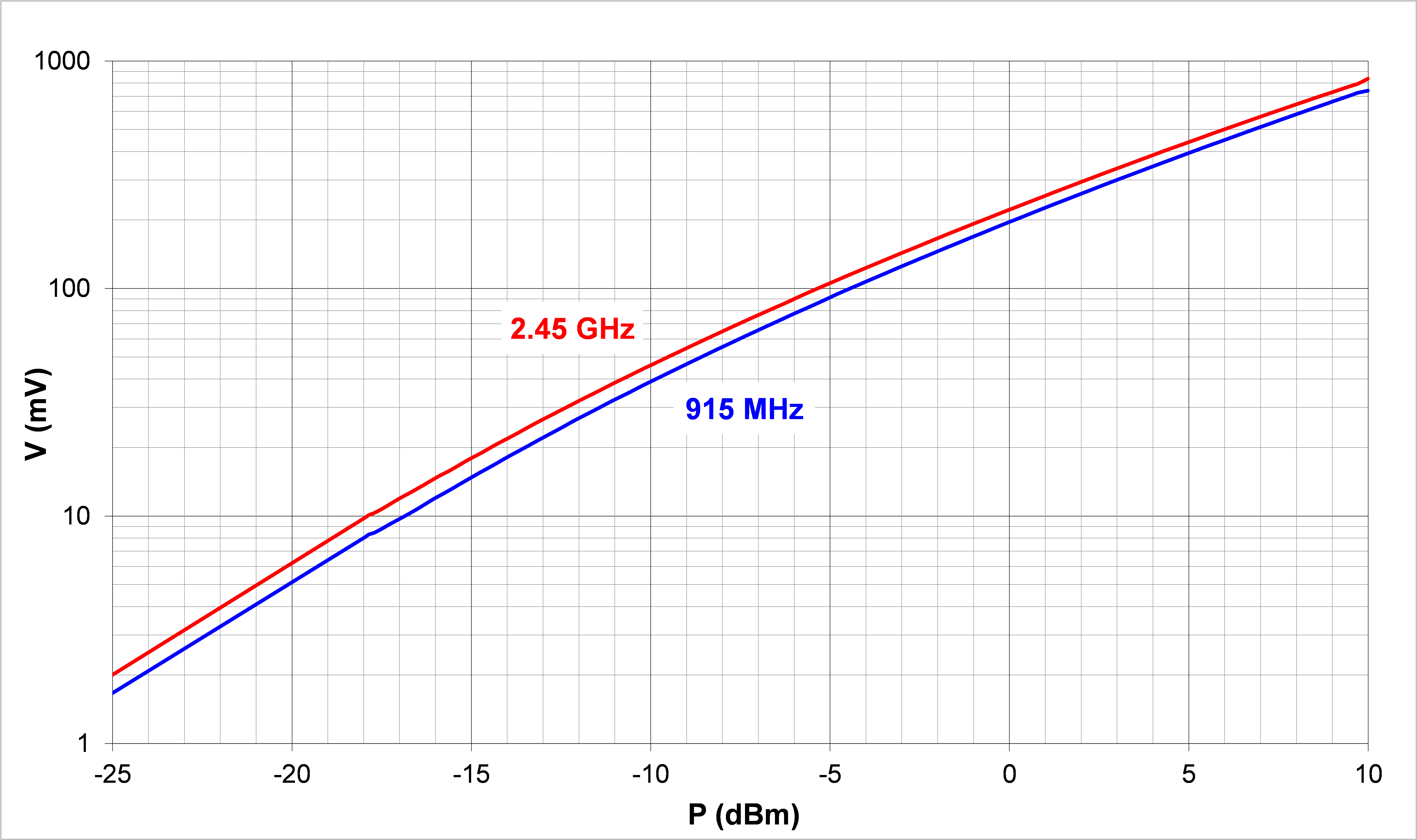 The detector delivers well-scaled DC voltage as a function of incident microwave power.