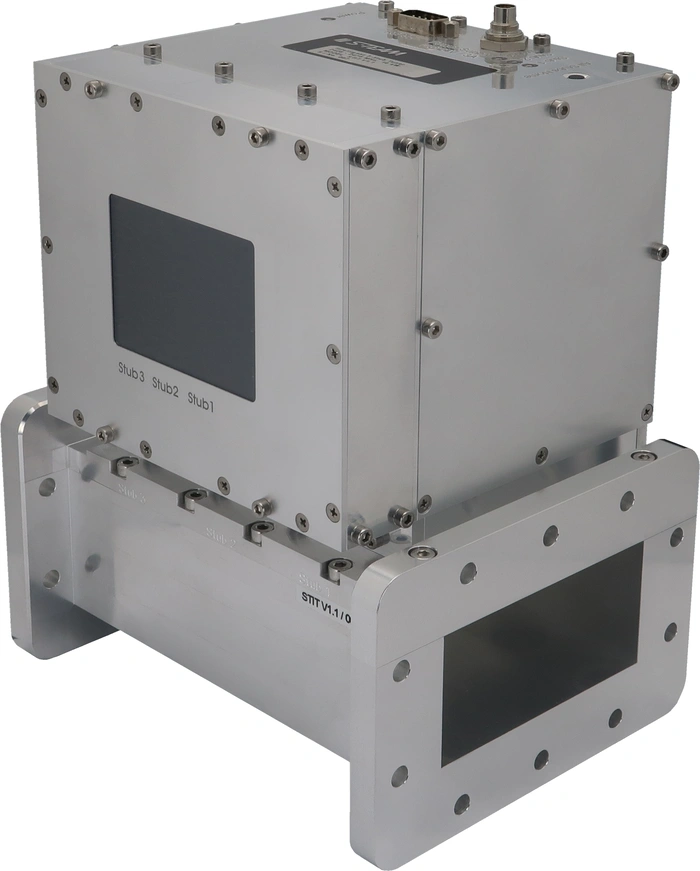 The STIT 2450 MHz Intelligent Three-Stub Tuner serves for manual impedance matching and, in connection with a waterload, for realization of reflection coefficients in wide range of the Smith Chart of the 2450 MHz ISM band. Based on the WR340 (R26) waveguide, the tuner basic design is derived from the HOMER-Series STHT 2450-MHz Autotuner. Each stub is equipped with a stepper motor and terminal switches. The desired stubs position can be easily adjusted and monitored by 3.2" colour LCD display with touch-panel. RS232, RS422 or CAN Bus interfaces are optionally available for remote control and monitoring.