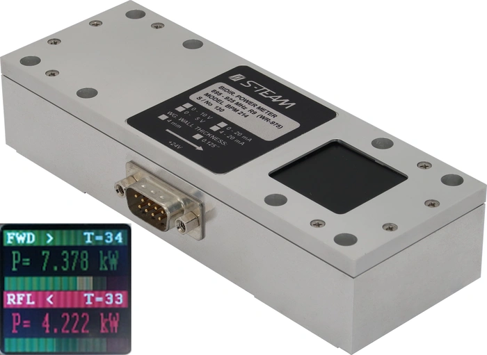 BPM214 is a bidirectional power meter serving for accurate simultaneous measurement of incident and reflected powers up to 100 kW in high-power 900 MHz industrial applications using an WR975 (R9) rectangular waveguide. Each power meter is calibrated individually.